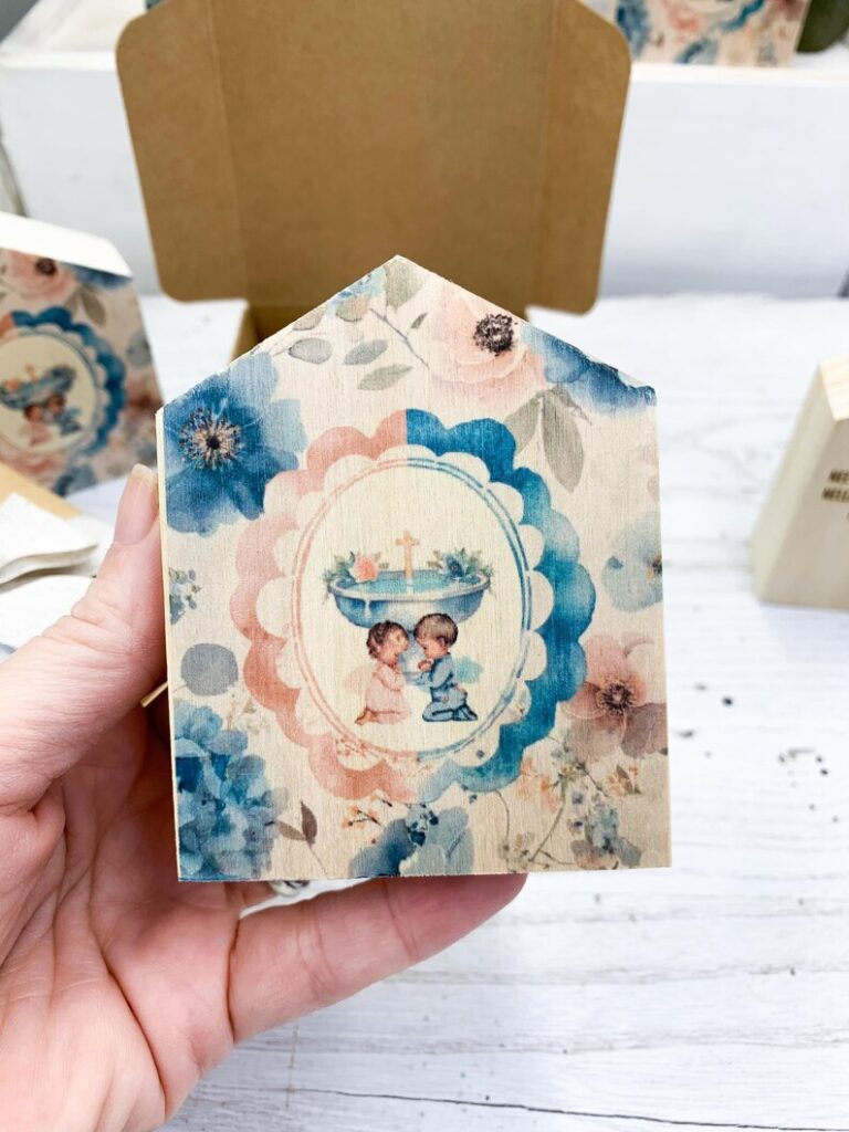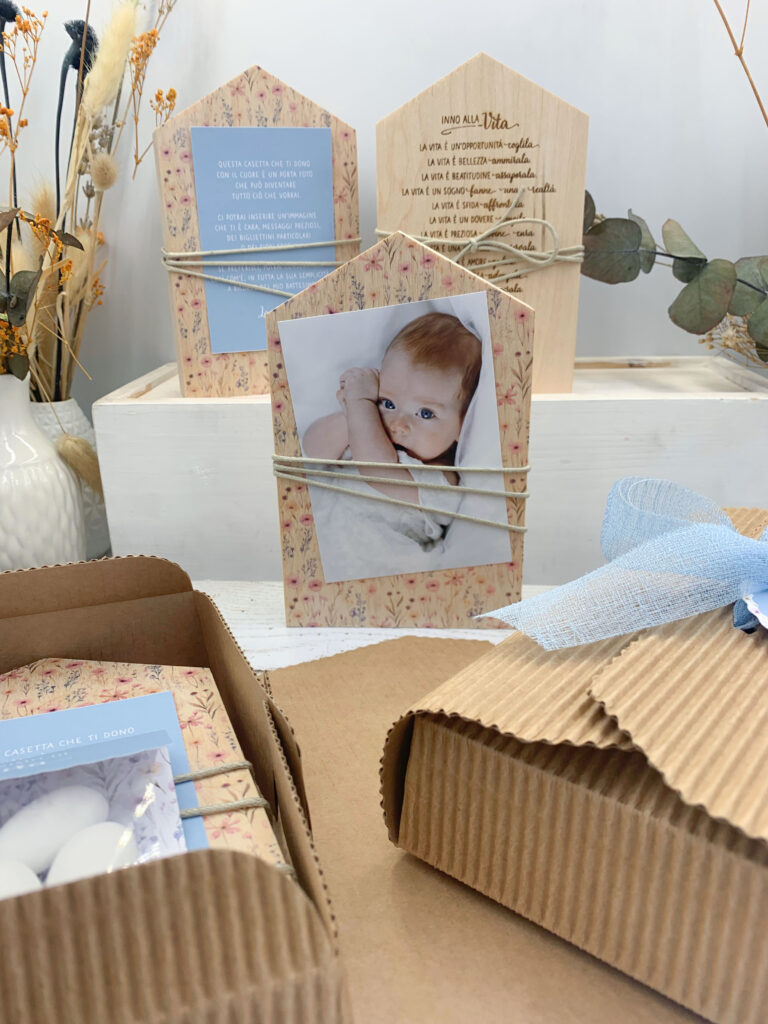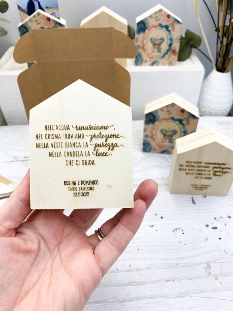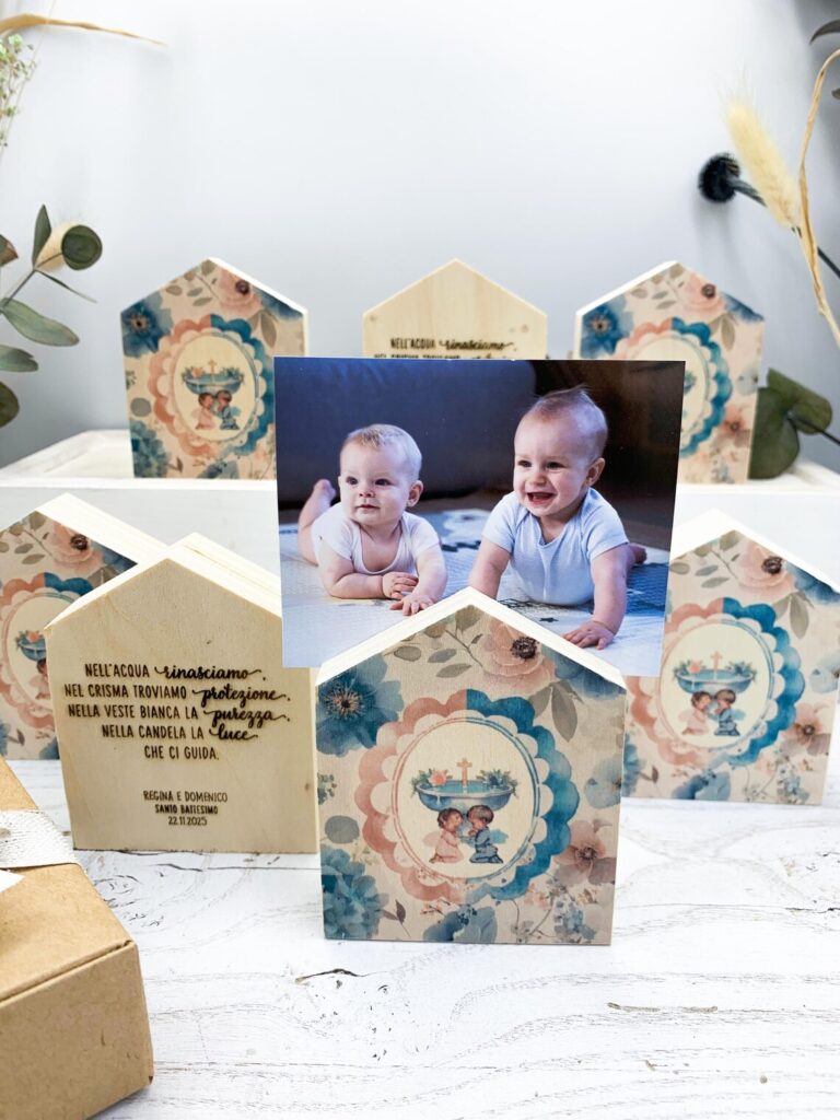 Tra le scelte più apprezzate per il Battesimo 2026 ci sono le bomboniere portafoto, piccole mini casette in legno pensate per durare nel tempo. Grazie alla fessura sul tetto, possono essere utilizzate come portafoto, custodendo una foto del bambino o della bambina, e diventano così un oggetto personale e significativo.