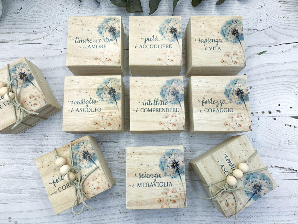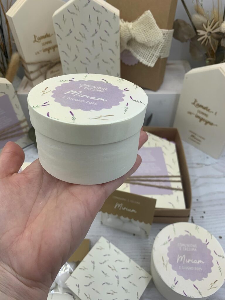 Piacciono perché sono sobrie ma piene di carattere, perché si adattano facilmente a diversi stili di festa e soprattutto perché possono essere personalizzate in molti modi diversi. Grazie alla lavorazione artigianale è possibile aggiungere frasi, nomi, date o piccole grafiche inerenti al sacramento della cresima, trasformando ogni scatolina in un ricordo unico.