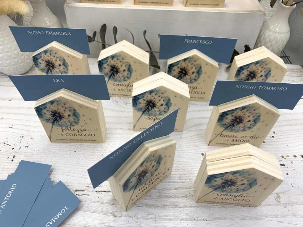 Una piccola casetta in legno personalizzata che può essere inizialmente utilizzata come segnaposto bomboniera durante il pranzo o la cena della cresima. Grazie alla fessura presente nella parte superiore, è possibile inserire un cartoncino in carta con il nome dell’invitato, permettendo così di assegnare il posto a tavola in modo elegante e curato. In questo modo ogni tavolo risulterà più armonioso e personalizzato, contribuendo a rendere l’allestimento della festa ancora più speciale.