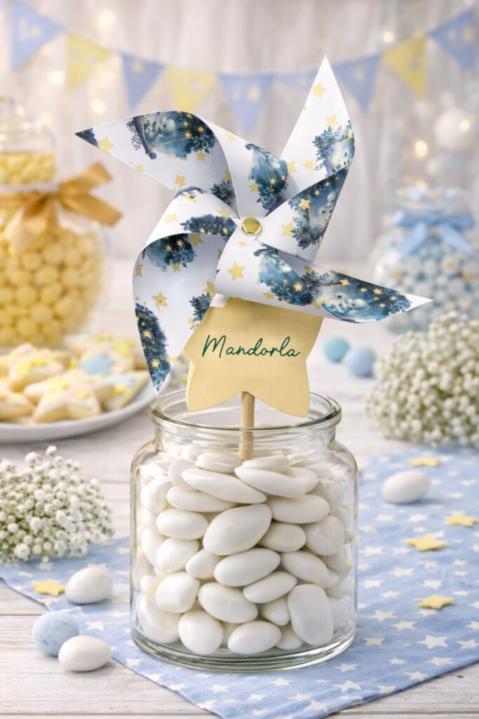 Accanto ai contenitori puoi posizionare coni di carta, bustine o piccoli sacchetti in carta, così che ogni invitato possa scegliere i propri gusti preferiti e preparare la propria porzione di confetti da portare via. Questo momento diventa spesso molto divertente e coinvolgente, soprattutto per i più piccoli.