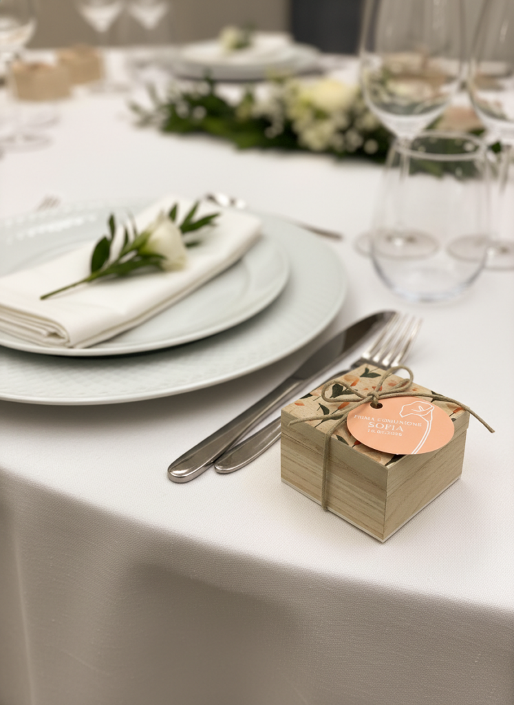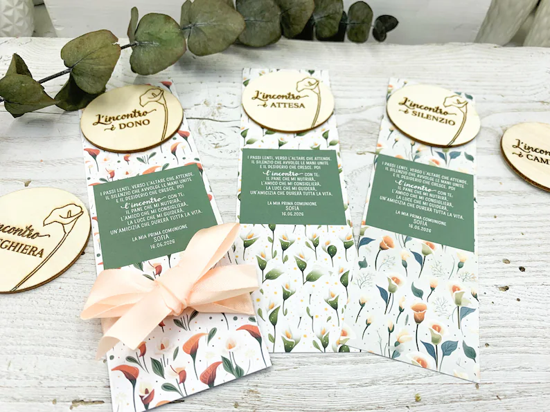 Molte famiglie oggi preferiscono bomboniere semplici ma significative, come oggetti in legno, segnalibri, segnaposto o piccoli ricordi artigianali. Sono idee economiche ma curate, capaci di raccontare la festa e lasciare un ricordo autentico.